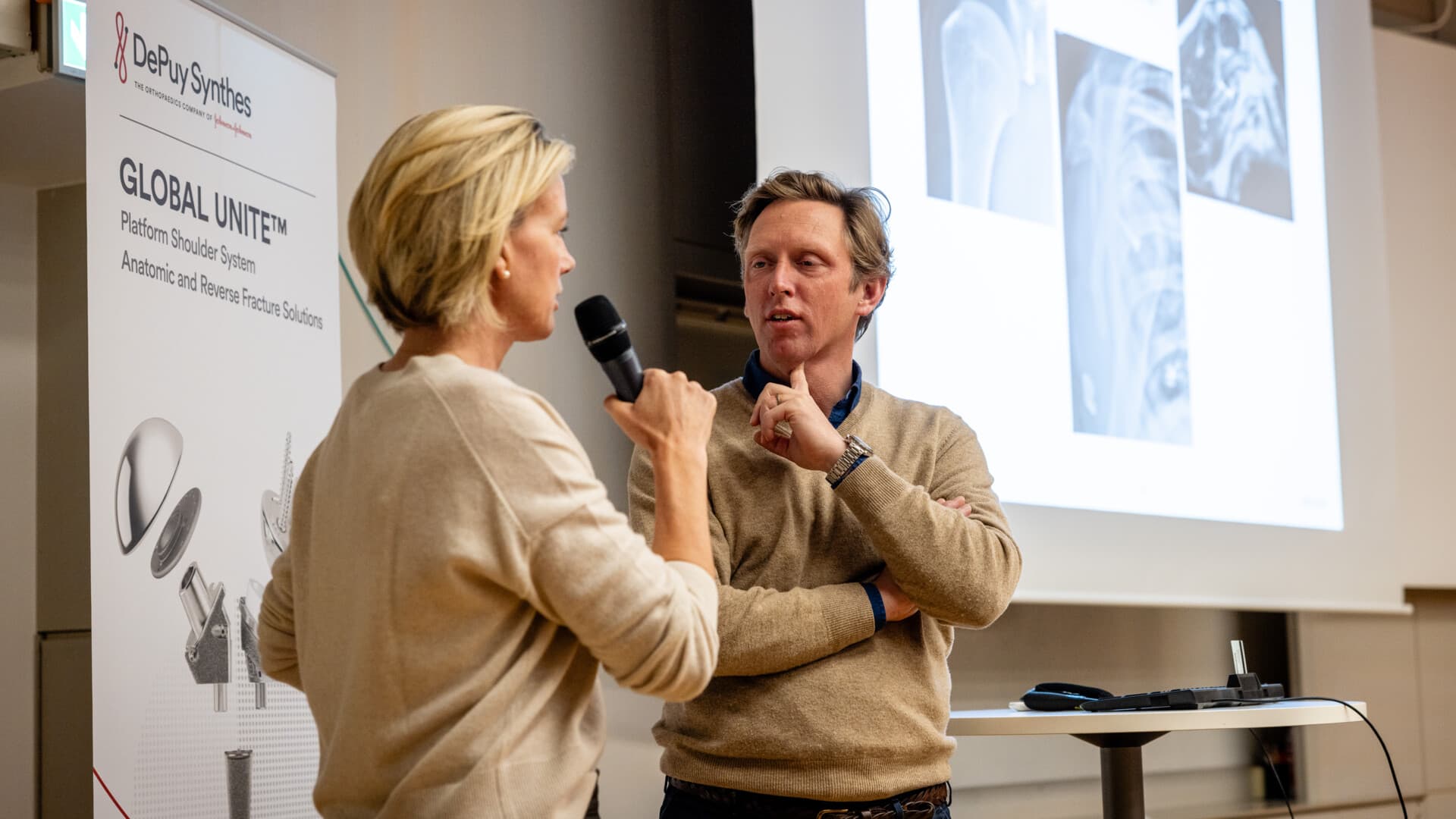 Efter det fick deltagarna träffa några patienter som opererats med den omvända axelplastiken. De berättade om sina upplevelser av tiden före operation, av tiden efter operation, och hur de nu kunde leva med mycket mindre smärta och besvär, och god rörlighet i sin nya axelled.